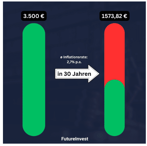 Die durchschnittliche Inflationsrate in Deutschland liegt über den aktuellen Rentenanpassungen. Zwischen 1960 und 2023 betrug die Inflation im Schnitt etwa 2,7 % pro Jahr. Das bedeutet, dass der reale Wert Ihrer Rente im Laufe der Zeit sinken wird. Nach 30 Jahren kann sich dies beispielsweise bei einer monatlichen Rente von 3.500 € erheblich bemerkbar machen, wie in der folgenden Grafik veranschaulicht wird: