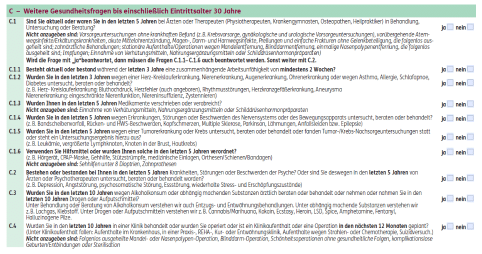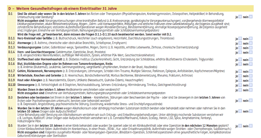 - „Bestehen oder bestanden bei Ihnen in den letzten 5 Jahren – Krankheiten, Störungen oder Beschwerden der Psyche – oder sind Sie deswegen in den letzten 5 Jahren von Ärzten oder Psychotherapeuten untersucht, beraten oder behandelt worden? (z.B. Depression, Angststörung, psychosomatische Störung, Essstörung, wiederholte Stress- und Erschöpfungszustände)“ – Früher war der Abfragezeitraum hier noch 10 Jahre, was sehr merkwürdig war. Durch das neue Update wurde es marktüblich auf 5 Jahre angepasst. Allerdings finden wir die Fragestellung nach Krankheiten, Störungen oder Beschwerden relativ offen gestellt.