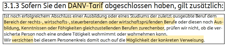 Interessanter ist der Verzicht auf die konkrete Verweisung durch die DANV, sowohl in der Erstprüfung als auch in einer Nachprüfung. Bei der konkreten Verweisbarkeit prüft ein Versicherer im Leistungsfall (Erstprüfung) oder auch später (Nachprüfung), ob der Betroffene freiwillig eine andere Tätigkeit ausübt und deshalb die Zahlung einer Berufsunfähigkeitsrente verweigert werden könnte. Auf diese Verweisung verzichtet die DANV für einen bestimmten Personenkreis: