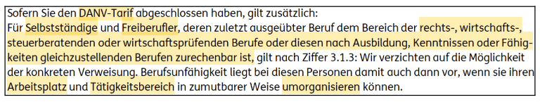 Der Verzicht auf die Umorganisationsklausel ist eine gute Regelung von der DANV, da heute keiner weiß, wann jemand selbstständig wird und das vor allem für Anwälte oder Steuerberater naheliegend ist. Einzigartig ist diese Regelung aber nicht am BU-Markt. Einige Top-Anbieter haben eine ähnliche Regelung in ihren Versicherungsbedingungen. Sie verzichten auf die Umorganisation, wenn zum Beispiel: