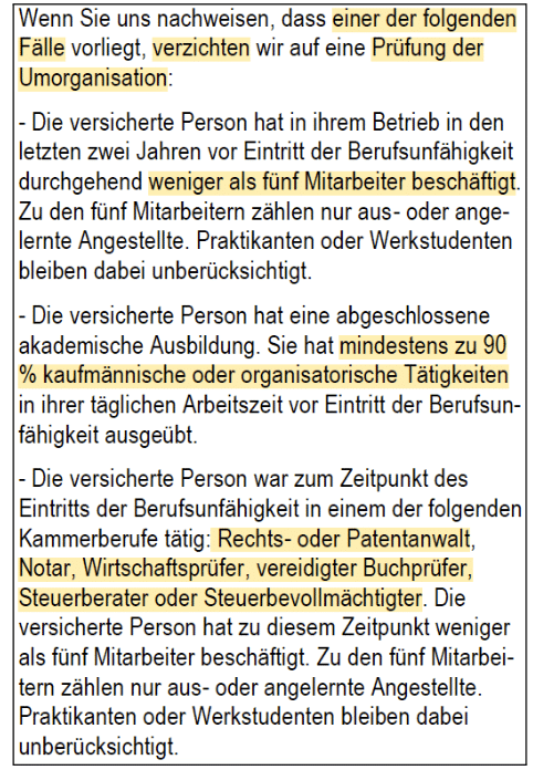 Mithilfe der Umorganisationsklausel kann der Versicherer geltend machen, dass der Selbstständige die Kanzlei oder den Arbeitsplatz umorganisieren kann und somit die Zahlung der BU-Rente umgehen. Auf die Überprüfung einer solchen Umorganisation verzichtet die DANV für einen bestimmten Personenkreis: