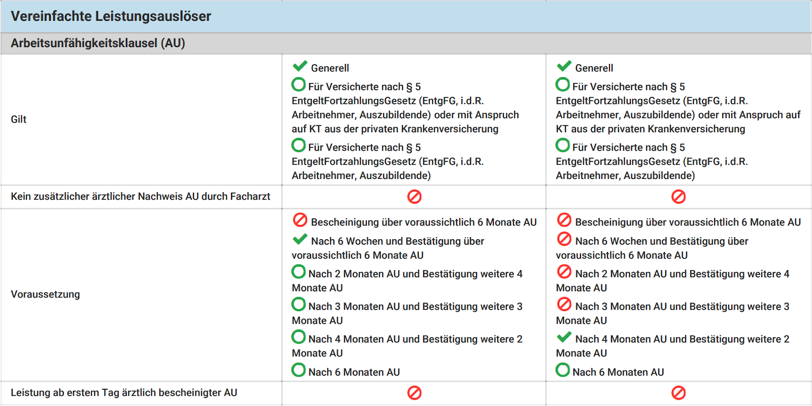 - die Leistungsdauer bei einer AU ist maximal auf 18 Monate beschränkt. Besser ist die Regelung bei der LV1871 mit 24 Monaten Leistungsdauer, erweiterbar auf 36 Monate unter bestimmten Voraussetzungen.