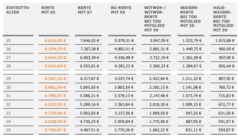 Die Rentenhöhe ist für die Zukunft nicht garantiert. Die tatsächliche Höhe ist von zahlreichen Faktoren abhängig, unter anderem von der Anzahl neuer Mitglieder, der Kostenquoten oder dem Rechnungszins.