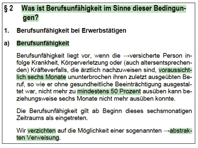 Wie regelt das ein privater BU-Versicherer in den Versicherungsbedingungen? Im Folgenden ein Beispiel: