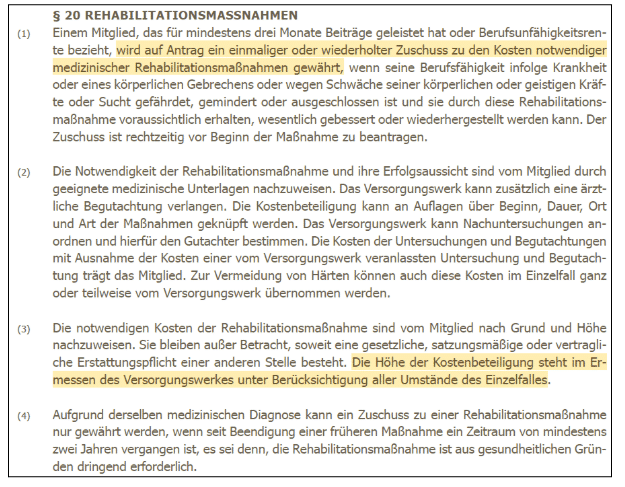 In der Satzung können wir lesen, dass die Regelungen zu Rehabilitationsmaßnahmen in der Satzung relativ offen gehalten sind. Die Höhe der Kostenbeteiligung steht im Ermessen des Versorgungswerkes unter Berücksichtigung aller Umstände des Einzelfalles.