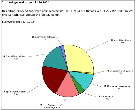 Beim Versorgungswerk der RA NRW handelt es sich um ein „offenes Deckungsplanverfahren“. Ein wesentliches Element dieses Verfahrens ist der kollektive Aufbau eines Kapitalstocks. Dabei werden die eingezahlten Beiträge verzinst und später verrentet. In der folgenden Abbildung sehen Sie die (relativ defensive) Anlagestruktur: