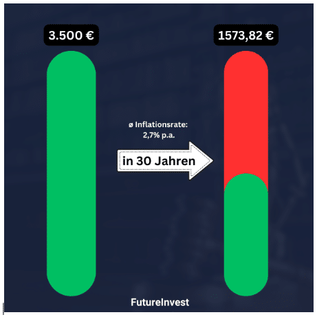 Die durchschnittliche Inflationsrate liegt allerdings deutlich darüber. In Deutschland lag von 1960 bis 2023 die durchschnittliche Inflationsrate bei 2,7% pro Jahr. Der reale Wert Ihrer Rente wird wahrscheinlich deutlich geringer ausfallen. Welche Auswirkungen die Inflation nach 30 Jahren auf eine Rente von z.B. 3.500 € im Monat haben kann, können Sie in der folgenden Abbildung sehen: