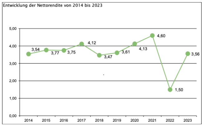 Die folgende Abbildung zeigt die Entwicklung der Nettorendite des Versorgungswerks der Rechtsanwälte NRW von 2014 bis 2023: