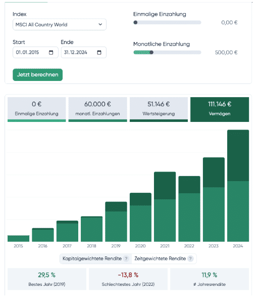 Anhand der Zahlen wird die defensive Anlagestrategie des Versorgungswerks deutlich. Vergleicht man beispielsweise die Rendite des Versorgungswerks mit der Rendite eines “Welt-ETFs”, der den MSCI All Country World Index abbildet, werden die Unterschiede deutlich. Beispielsweise hätte von 2015 bis 2024 eine monatliche Investition von 500 € ein Endvermögen von 111.146 € und eine durchschnittliche Jahresrendite von 11,9% erbracht: