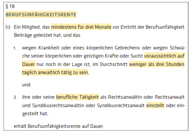 - Der Anspruch auf eine Berufsunfähigkeitsrente besteht erst, wenn Sie in der Lage sind, weniger als drei Stunden täglich anwaltlich tätig zu sein.