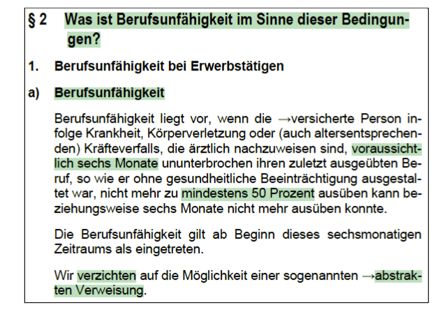 Schauen wir uns im folgenden Beispiel an, welche Regelungen ein BU-Versicherer in den Versicherungsbedingungen festgelegt hat: