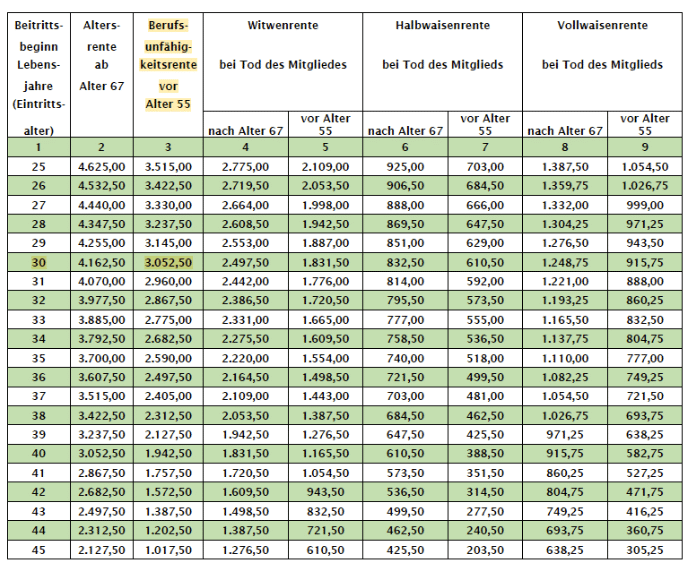 Hierfür schauen wir im Mitgliederrundschreiben 2024/2025 des Versorgungswerks der RA NRW. Ein Rechtsanwalt, der den Regelpflichtbeitrag einzahlt (der aktuell höchstmögliche Beitrag von 1.497,30 € im Monat, das sind 18,6% von 8.050 € Monatseinkommen) hätte bei einem Eintrittsalter von 30 Jahren einen Anspruch auf eine Berufsunfähigkeitsrente von 3052,50 €: