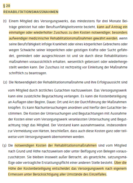 Die Regelungen zu Rehabilitationsmaßnahmen sind in der Satzung relativ offen gehalten. Es ist von einer „Kann-Regelung“ die Rede. Das Versorgungswerk entscheidet über die Höhe der Kostenbeteiligung nach eigenem Ermessen unter Berücksichtigung aller Umstände des Einzelfalles.
