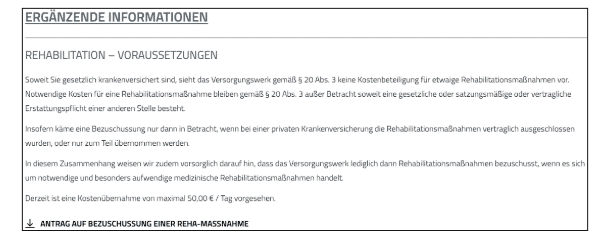 Zudem weist das Versorgungswerk der Rechtsanwälte NRW auf seiner Website darauf hin, dass Rehabilitationsmaßnahmen nur dann bezuschusst werden, wenn es sich um notwendige und besonders aufwendige medizinische Rehabilitationsmaßnahmen handelt. Sie sehen derzeit eine Kostenübernahme von maximal 50,00 € am Tag vor.