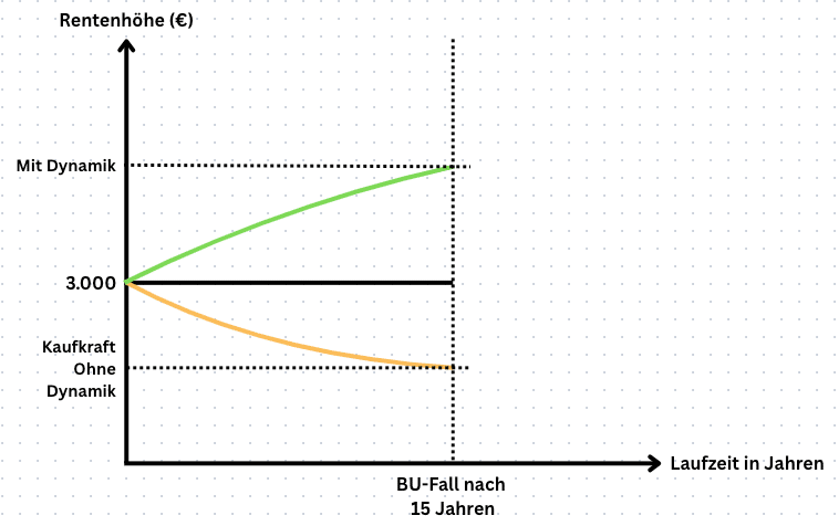 Dadurch erhöht sich deine BU-Rente bis zu einem Leistungsfall jährlich um einen bestimmten Prozentsatz, z.B. um 3 oder 5 Prozent. Die Absicherung passt sich