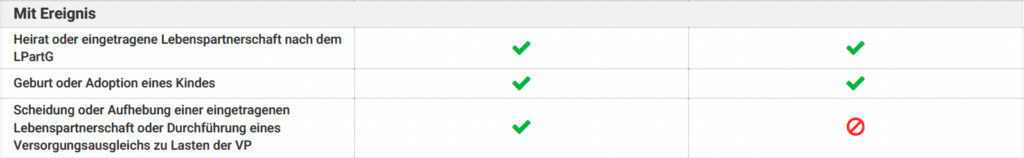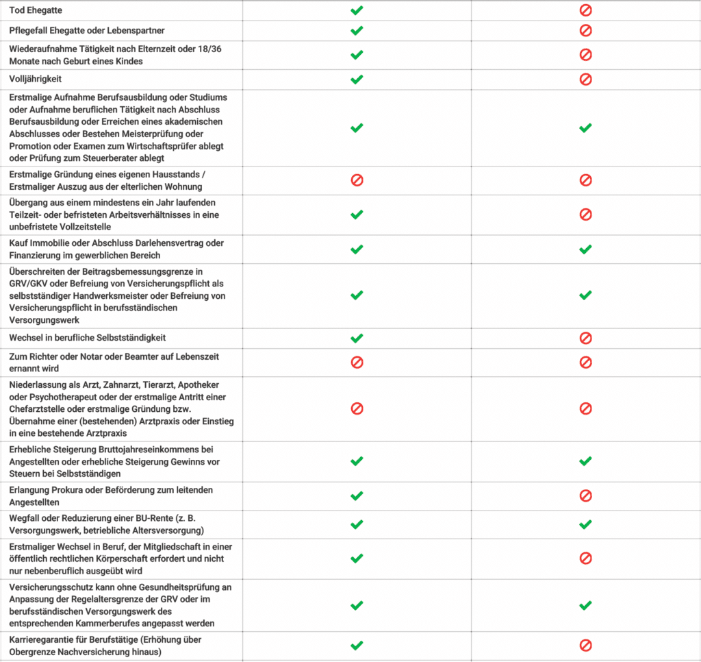 Hier ein Beispiel zweier BU-Anbieter von Ereignissen, die bei der Nachversicherungsoption mit Ereignis möglich sind oder nicht (Quelle: PremiumCircle Tarifinhalte):