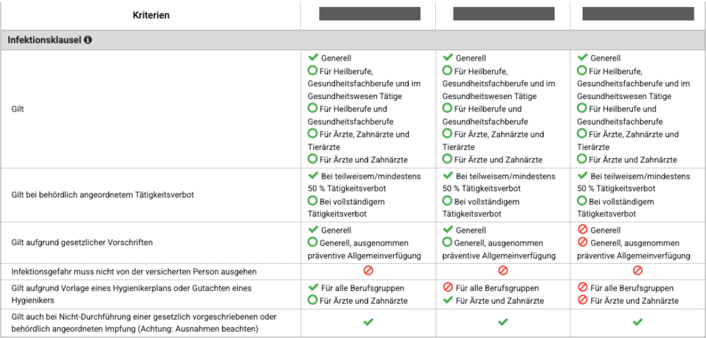 Ein solches Tätigkeitsverbot kann vor allem Ärzte, Zahnärzte oder Pflegepersonal betreffen. Es sollte darauf geachtet werden, wie die Infektionsklausel inhaltlich ausgestaltet ist. Einige Anbieter begrenzen die Infektionsklausel auf bestimmte Berufsgruppen und einige Anbieter sehen auch Leistungen ohne ein behördlich angeordnetes Tätigkeitsverbot vor.