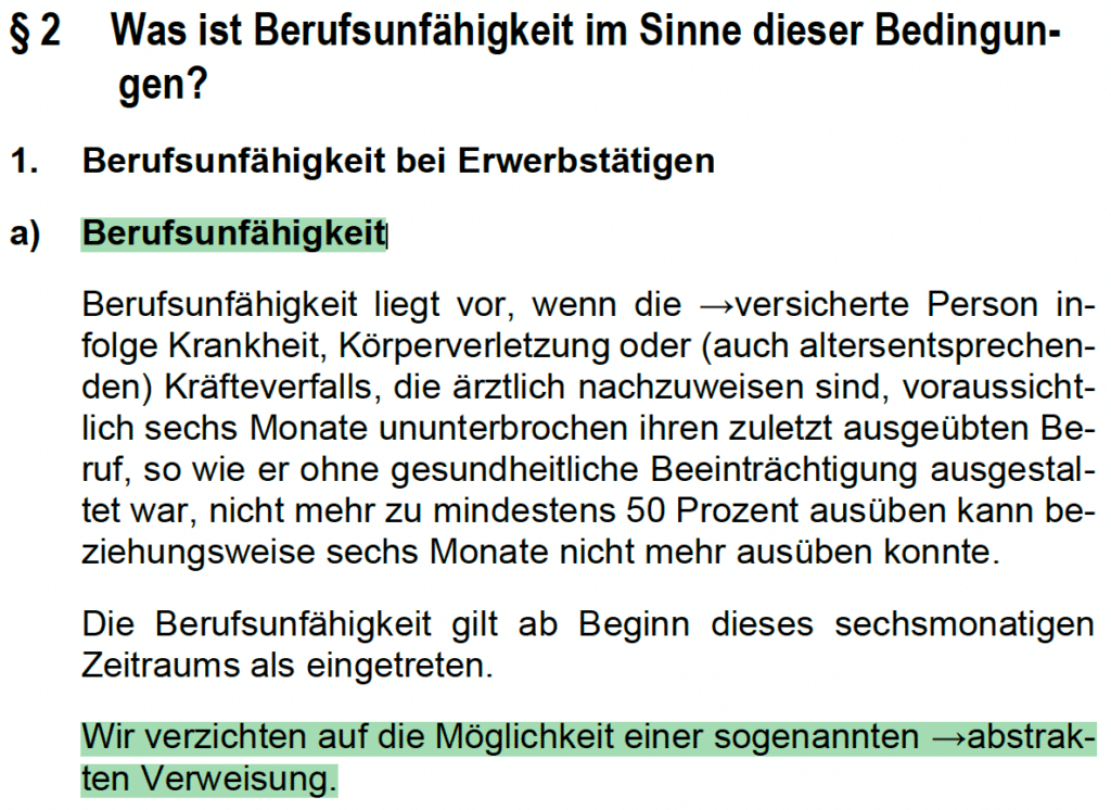 Ob es tatsächlich eine solche Stelle auf dem Arbeitsmarkt gibt und du diese erhältst, ist dabei übrigens irrelevant. Ein Verzicht auf die abstrakte Verweisung bietet dir also eine höhere Sicherheit, dass die Leistungen auch tatsächlich ausgezahlt werden, wenn du deinen aktuellen Beruf nicht mehr ausüben kannst. Fairerweise muss man sagen, dass moderne BU-Anbieter auf die abstrakte Verweisung verzichten. Allerdings sollte es klar in den Versicherungsbedingungen formuliert werden. Im Folgenden ein positives Beispiel: